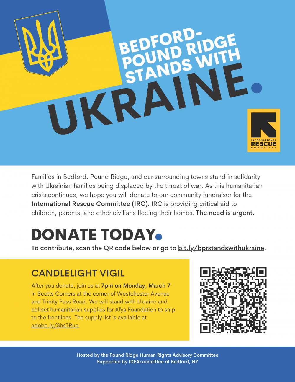 In a united effort to support the Ukraine, a group of concerned residents from the Bedford-Pound Ridge area have organized an online fundraiser, called Bedford-Pound Ridge Stands with Ukraine, to help provide immediate aid to displaced families and other civilians affected by the recent humanitarian crisis. All monetary donations will go to the International Rescue Committee (IRC), which has identified over two dozen NGOs responding to critical needs on the ground. Hosted by the Pound Ridge Human Rights Advisory Committee and with support from the IDEAcommittee of Bedford, NY, the community fundraiser will also feature a candlelight vigil in Scotts Corners at 7:00 pm on Monday, March 7 (at the corner of Westchester Avenue and Trinity Pass), during which residents can gather to stand in solidarity and also drop off donations of humanitarian supplies. Supplies will be donated to the Yonkers-based Afya Foundation to ship to the frontlines. View the supply list at here or alternately, purchase items from the Amazon Wish List here to send directly to Afya.